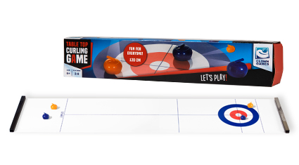 Met dit tabletop curling spel kun je gewoon thuis een potje curlen! Rol de speelmat uit op een tafel, plaats de magnetische strips en je kunt beginnen! Je speelt de curlingstenen door ze met je vingers vast te pakken en over de speelmat te schuiven. Het doel van curling is om punten te scoren, door jouw steen zo dicht mogelijk bij het midden van het huis aan de overkant van het speelveld te schuiven. Het team met de meeste punten aan het eind van een aantal rondes, wint het spel.